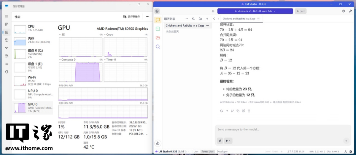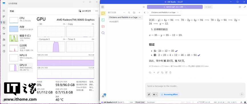 在四款模子中,IT之家使用了相同的鸡兔同笼问题对其进行测试,在 8b 模子中,其推理速率可达 41.05 token/s,GPU 只满载了短短几秒。