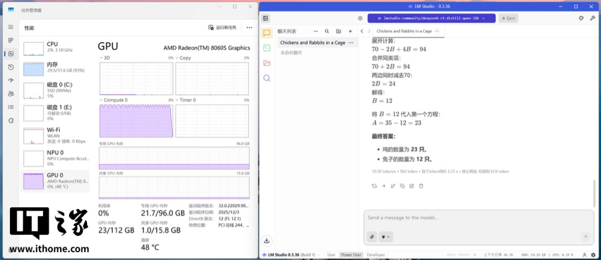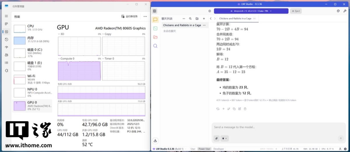 Phi-3.5-mini-instruct 边幅 977 分;Mistral-7B 边幅 881 分;Llama-3.1-8B 边幅 798 分;Llama-2-13B 边幅 978 分。4.AI 实测AMD 锐龙 AI Max+ 395 处理器不仅具备为大模子量身打造的超强算力,合营 128GB 的超大内存,其还简略顺利开动高端孤独显卡都无法腹地部署的 AI 大模子。毕竟即使是蒸馏后的 70B 模子,对传统独显的显存条款也特等离谱了。IT之家这里使用 LM Studio 辩别部署了 DeepSeek R1 的 8b、14b、32b 和 70b 模子。