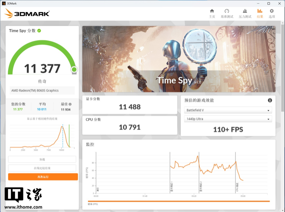 在 3D Mark Time Spy 边幅中,显卡成绩达到了 11488 分,这个成绩依然向上了桌面端 RTX 4060 显卡的水平。