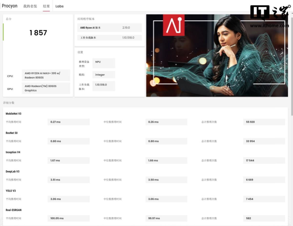 IT之家开始进行了 UL Procyon 的 AI 推理测试,这项以 NPU 进行推理任务的测试,得分 1857 分。