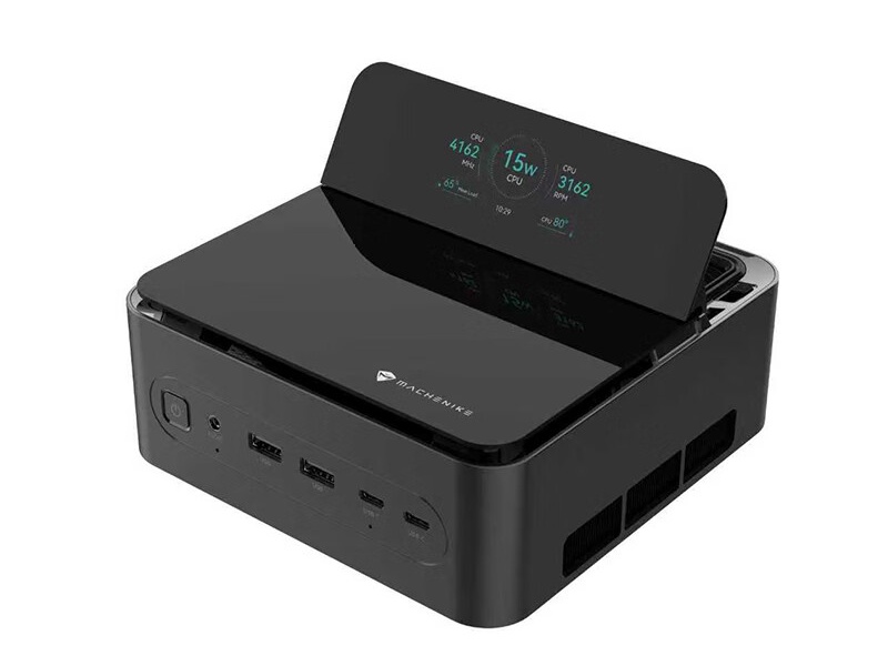 机械师 Mini GTS 迷你主机接纳一体成型金属机身,配备翻起式参数监控 TFT 屏幕和 RGB 灯带。其搭载 Y+U 双热管四电扇散热系统,提供 2 条 DDR5-5600 SO-DIMM 内存插槽和 2 个 M.2 盘位,配备 Wi-Fi 6E & BT 5.3 无线网卡。