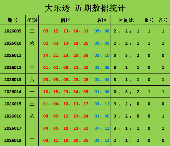 大乐透上期开出奖号:09 11 19 30 35+01 12,区间比是2 : 1 : 2,莫得开出连号,莫得开出重号。
