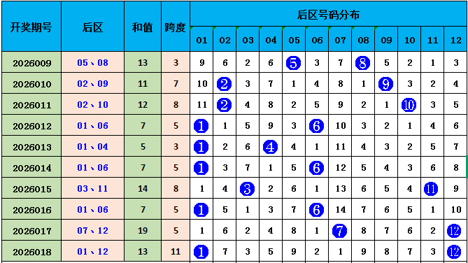 上期后区开出号码01、12,和值13,最近十期,和值开出界限在5--19之间,波动较大。本期预测和值较上一期握平,精选一注后区和值13,推选02、11。