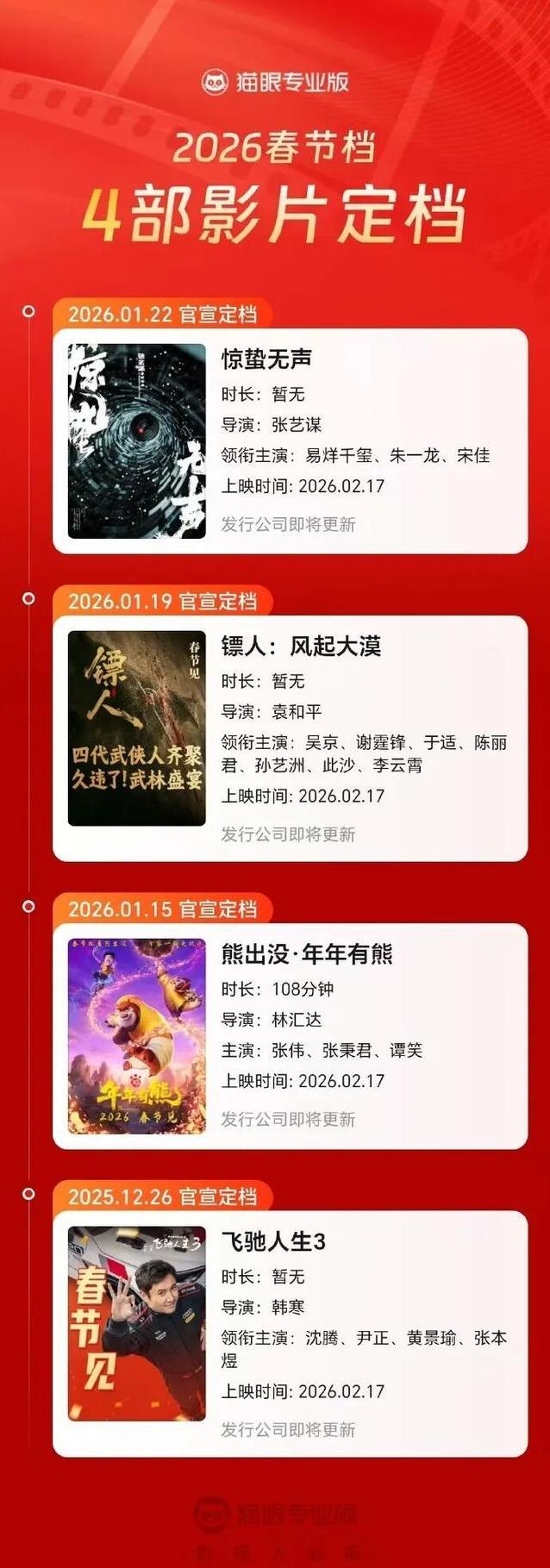 四部片子各占一席。剧情片有《惊蛰无声》,动作武侠有《镖东谈主:风起大漠》,笑剧有《奔突东谈主生3》,动画有《熊出没·年年有熊》。类型障翳面广,不雅众经受余步大了。假期九天本事长,市集容量也比往年足。最终谁能笑到临了,取决于故事讲得怎样样,神志能不成共识。