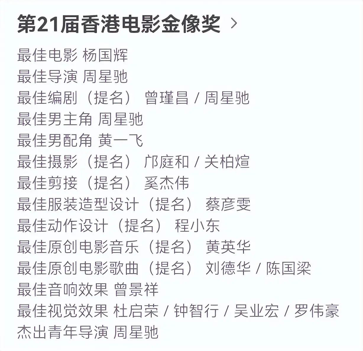 而在第21届中国香港电影金像奖上,《少林足球》还取得过十几项提名,其中担任导演、编剧兼主演的周星驰,更是捧回了最好导演和最好男主的奖杯。