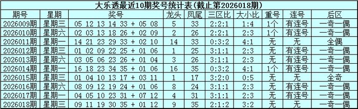 大乐透第2026018期奖号为:09、11、19、30、35+01、12。其中前区三区比为2:1:2,大小比为3:2,莫得出现重号,莫得出现连号,后区为一奇一偶号码。